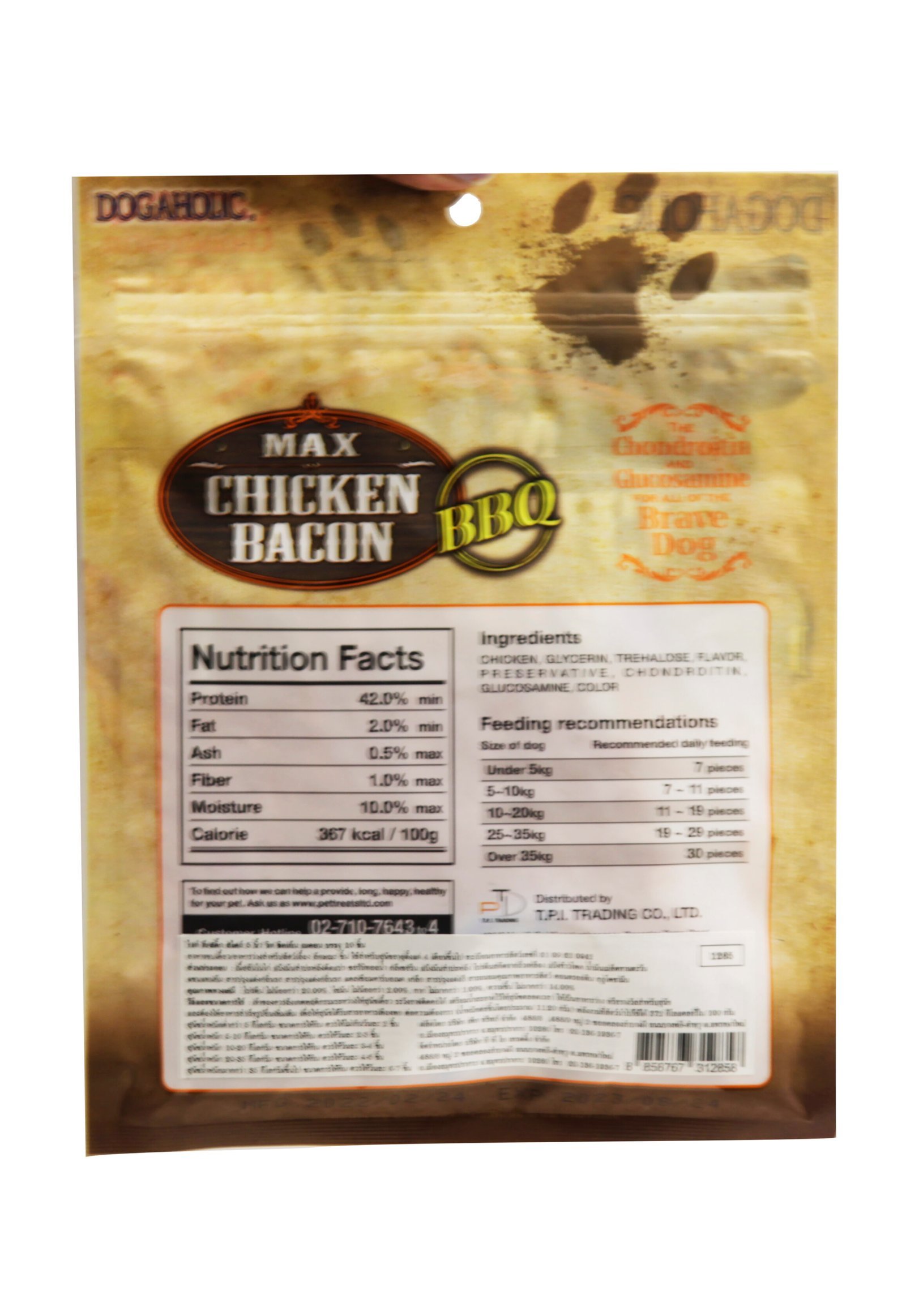 Exceptionally high protein snack with low-fat content; attractive packaging with zip-lock for increased shelf-life; suitable for all breeds and ages; Made in Thailand. The Dogaholic Max Barbeque Bacon Sticks are a highly palatable treat with high nutritional value, prepared using real chicken meat and high-quality ingredients.