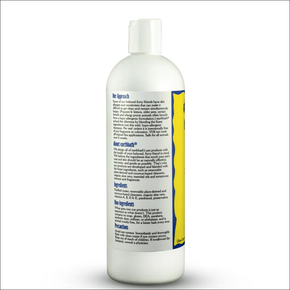 EarthBath shampoo for some of our beloved furry friends have skin allergies and sensitivities that can make it difficult to get clean and remain simultaneously happy. (Puppies & kittens, older pets, certain breeds and allergy prone animals often benefit from a hypo-allergenic formulation.) Earthbath solved this dilemma by blending the finest ingredients into this mild, hypo-allergenic shampoo. Per vets’ orders it is intentionally free of any fragrance or coloration. Will not wash off topical flea applications. Safe for all animals over 6 weeks
