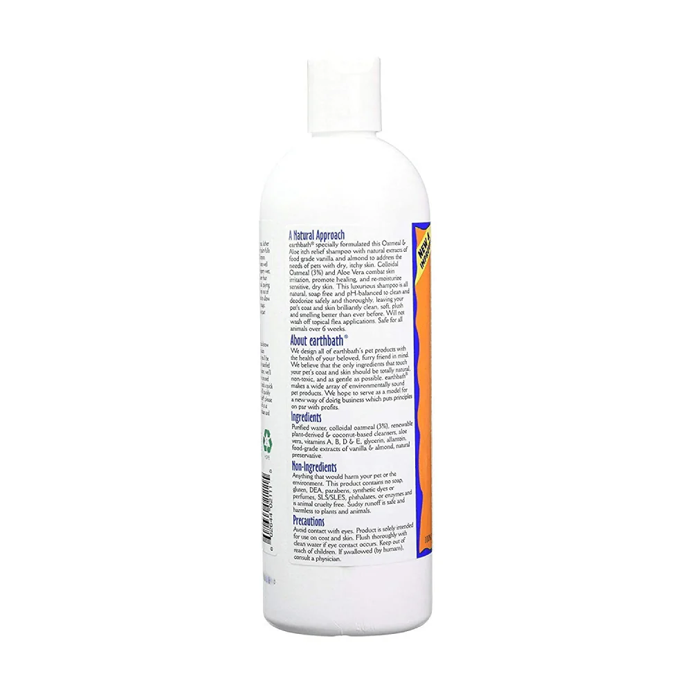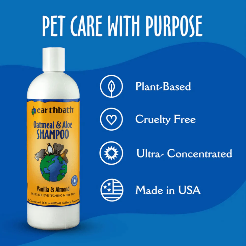 EarthBath Collodial Oatmeal and Organic Aloe Vera help combat skin irritation, promote healing, and re-moisturize sensitive, dry skin. Our Oatmeal & Aloe Shampoo with Vanilla & Almond scent will not wash off topical flea applications and is safe for all pets over 6 weeks. This luxurious shampoo is soap free and pH-balanced to clean and deodorize safely and thoroughly, leaving your pet's coat and skin plush and smelling better than ever before