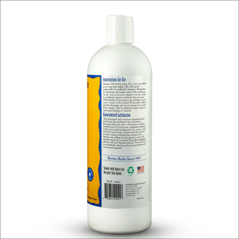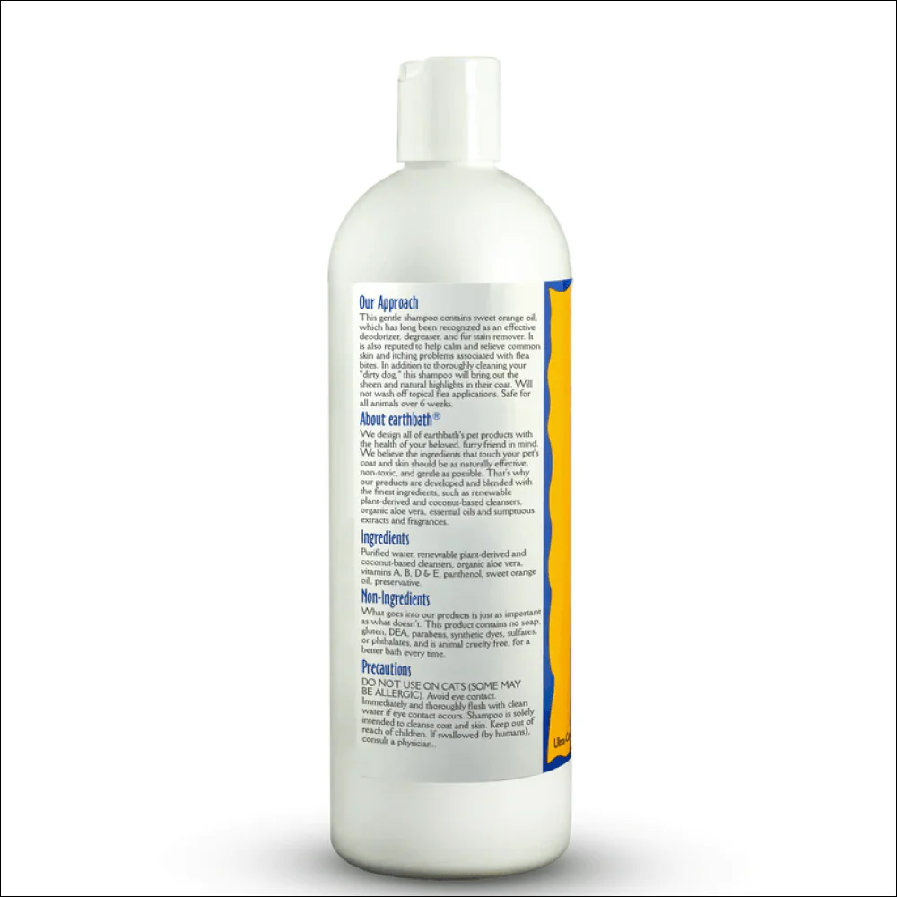 This gentle shampoo contains sweet orange oil, which has long been recognized as an effective deodorizer, degreaser, and fur stain remover. It is also reputed to help calm and relieve common skin and itching problems associated with flea bites. In addition to thoroughly cleaning your dirty dog, this shampoo will bring out the sheen and natural highlights in their coat. Will not wash off topical flea applications. Safe for all animals over 6 weeks.