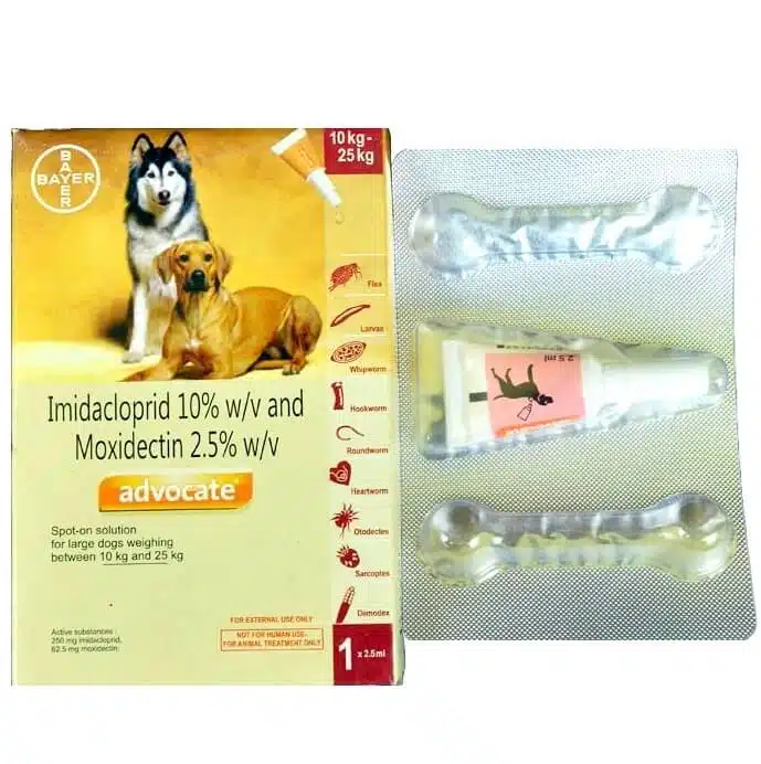 Advocate spot-on treatment, formerly owned by Bayer and currently owned by Elanco, provides dogs with all-around parasite protection against flea infestation, lice, hookworms, roundworms, heartworm disease, ear mite treatment, and sarcoptic mange brought on by sarcoptic mites. It has the widest range of antiparasitic properties. It affects ectoparasites as well as endoparasites.