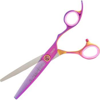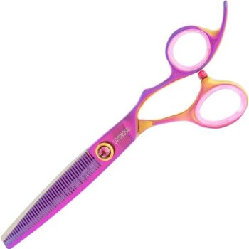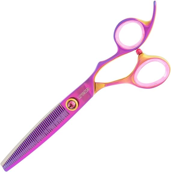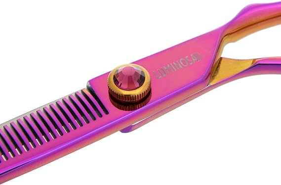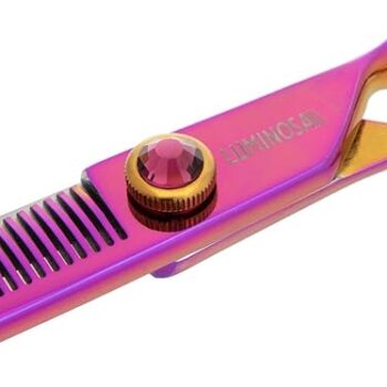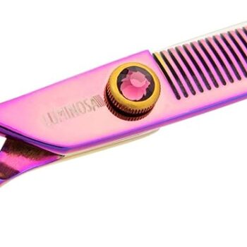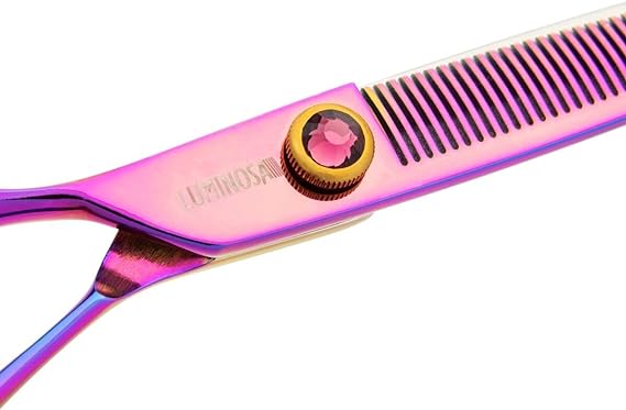 The most popular Groom Professional scissor range. Luminosas add style and substance to any salon. Finished with a luminescent rainbow coating and purple gemstone, these scissors are sure to stand out, while the Japanese Cobalt steel blades result in unrivalled cutting performance and durability. Luminosa Chunker scissor range Perfect for creating angles, these 20-tooth and 26-tooth chunkers deliver the ultimate quality and style. Just like all Luminosa scissors, these chunkers are made with Chinese VG-10 steel. The convex edge assists in cutting soft edges. Level 3 Scissors Chunkers Professional scissors Japanese Cobalt Steel Hardness.