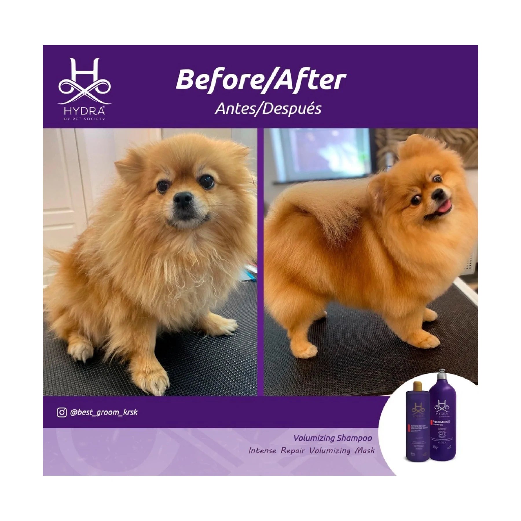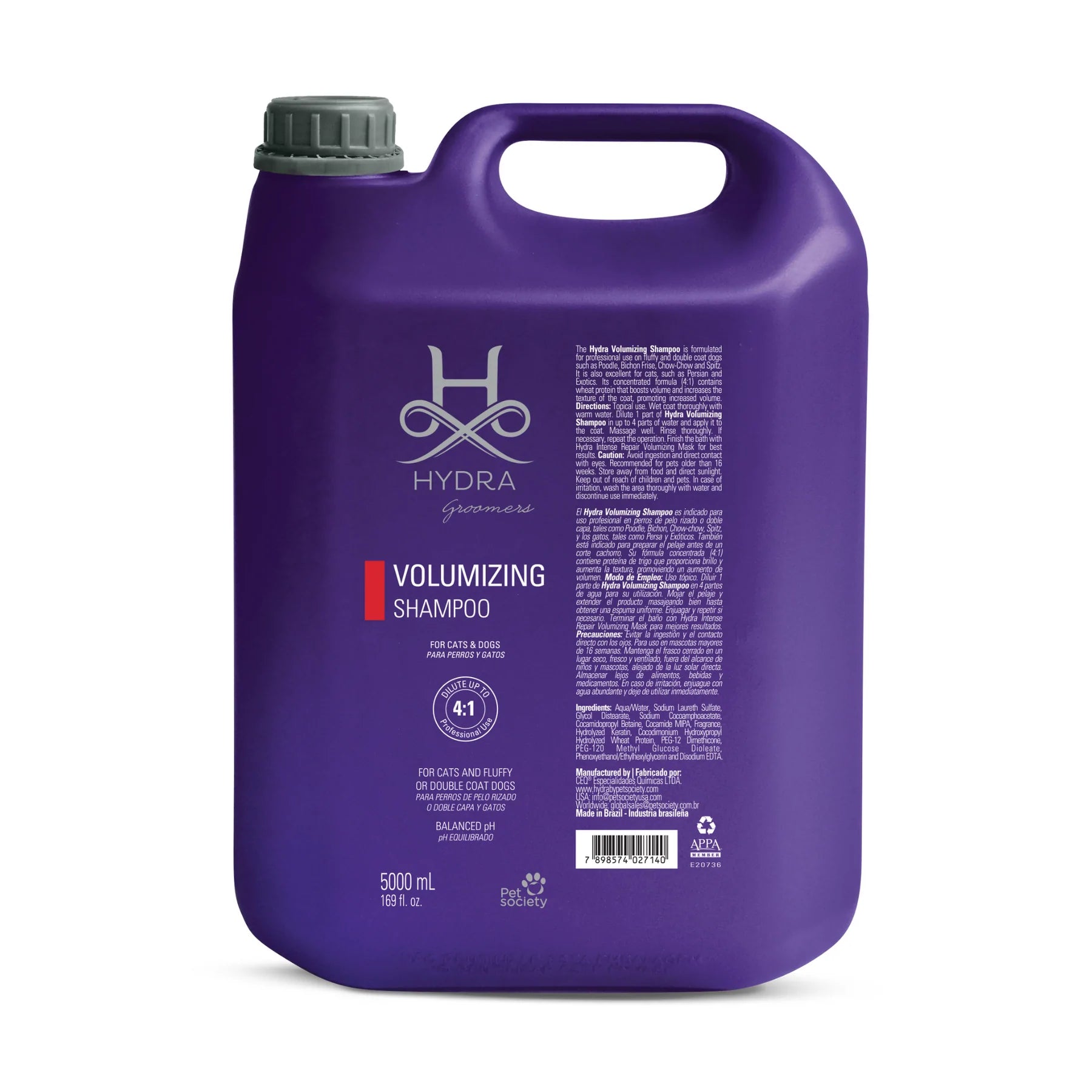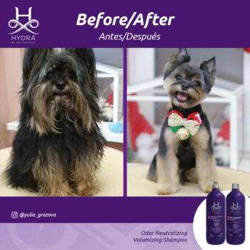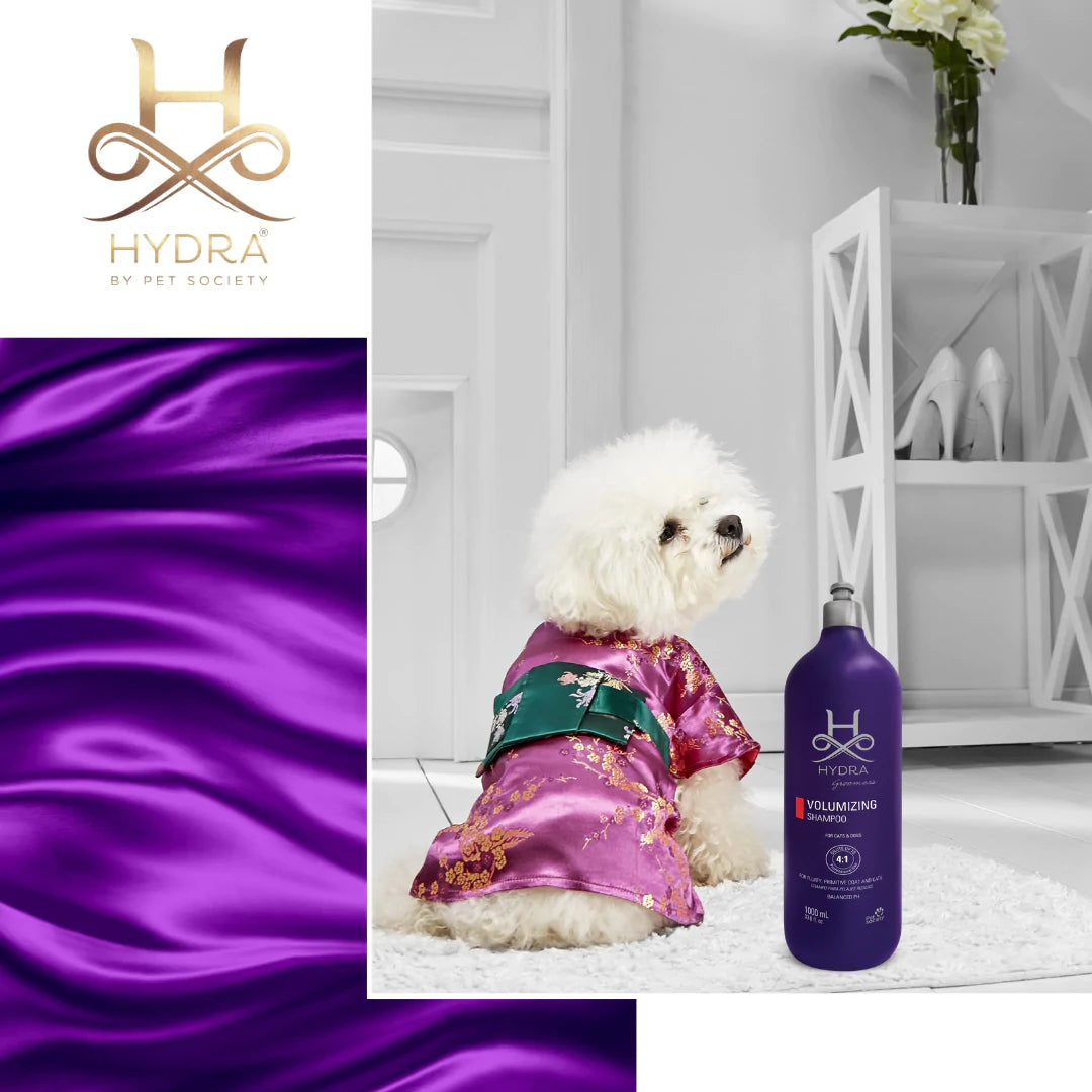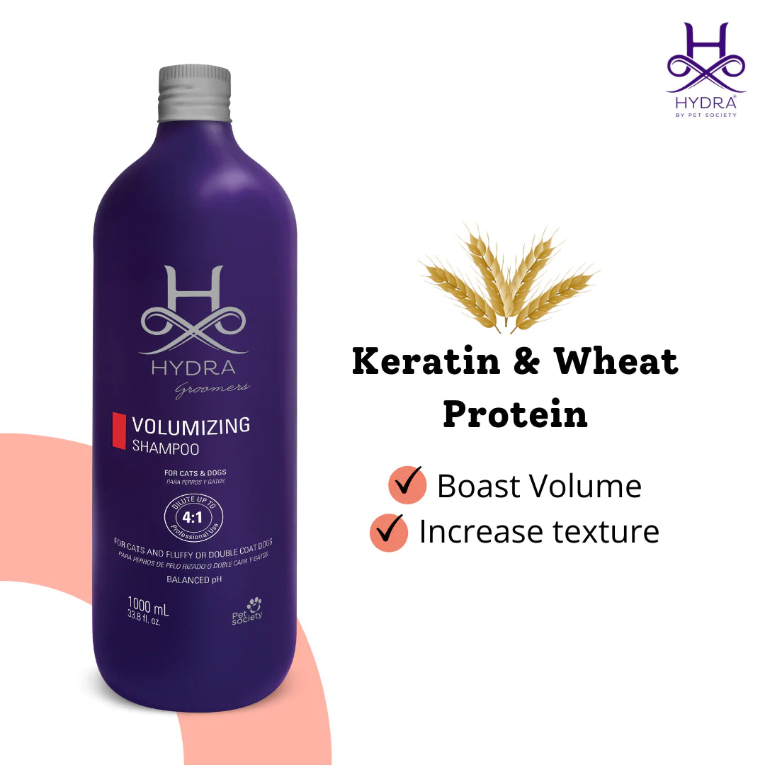 Hydra Professional Shampoos are every Pet Professional’s Absolute Choice, Infused with Salon–Grade Ingredients to experience a luxurious grooming experience for every pet & pet professional. Hydra Volumizing Shampoo is made for professional use on dense and curly coat types such as Poodles, Bichon Frisés, Chow-Chows, and Spitz. This shampoo is also excellent to use on cats such as Persians and Exotics. The concentrated formula contains keratin and wheat proteins to boost volume and increase the texture of the coats. This is a professional shampoo designed by groomers for groomers and is suitable for all breeds of dogs and cats.
