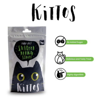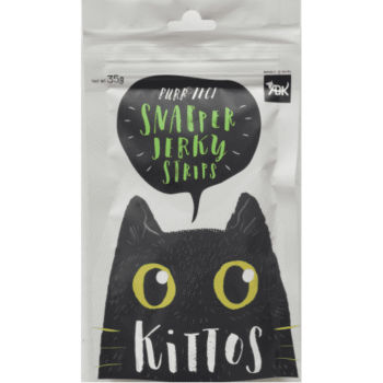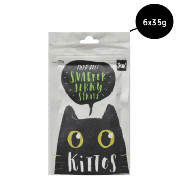 Kittos purr-fect snapper jerky strips cat treats are made small to suit cat sized mouths. They are made with snapper fish.