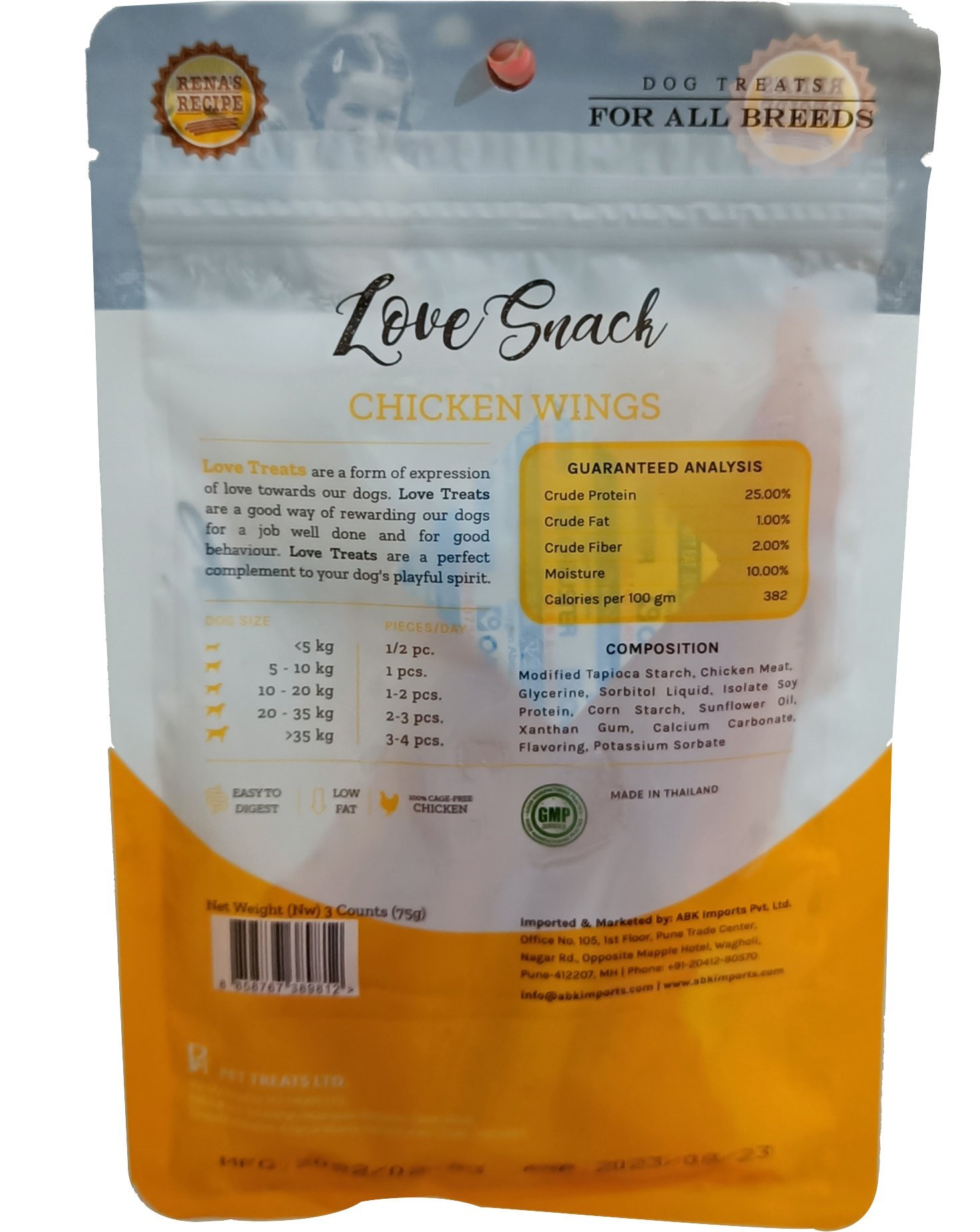 Rena's Love Chicken Wings Puppy & Dog Treat is a delicious and crispy treat that contains highly digestible protein from chicken. It is packed in an airtight bag to help maintain their crunchiness. Rena's Love Chicken Wings contains no artificial flavours or preservatives. Up to 70% pure meat provides high protein and thus provide strong bones and muscles.