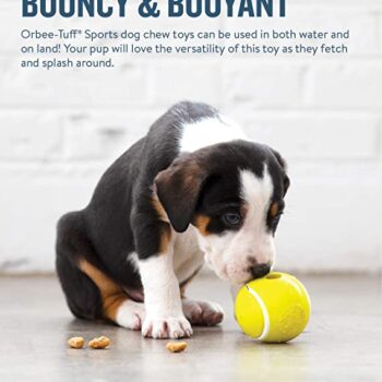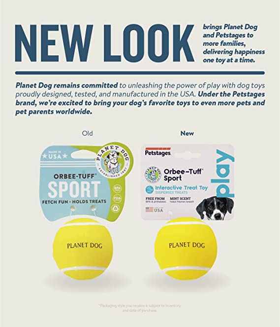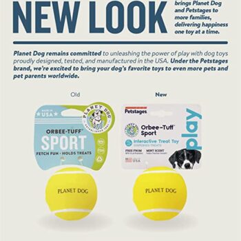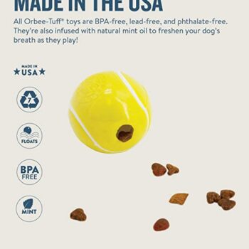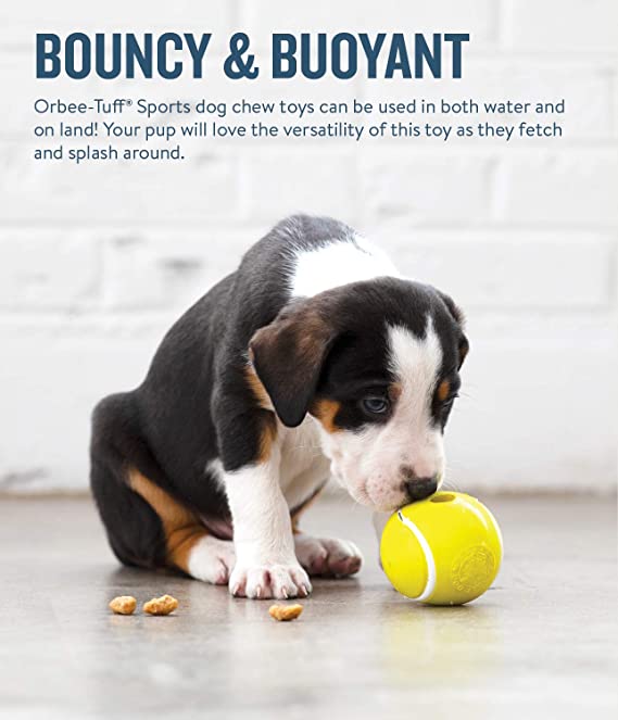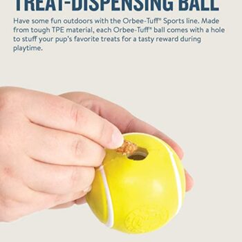 ime to play ball with Planet Dog's Orbee-Tuff Sports line! With different sizes and sports to choose from, you're sure to find your dog's new favorite all-in-one fetch, chase, and chew toy! Each ball comes with holes on either side to stuff with treats to keep your dog stimulated and keep their cravings at bay. All Orbee-Tuff toys are made from a durable TPE material that is BPA, lead, and phthalate-free. Clean with warm water, mild soap and rinse. Not all sizes are suitable for all chewers and all sizes. Sizing: The Orbee-Tuff Tennis ball is 2.5" in diameter, has a classic look and is great for small dogs.