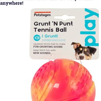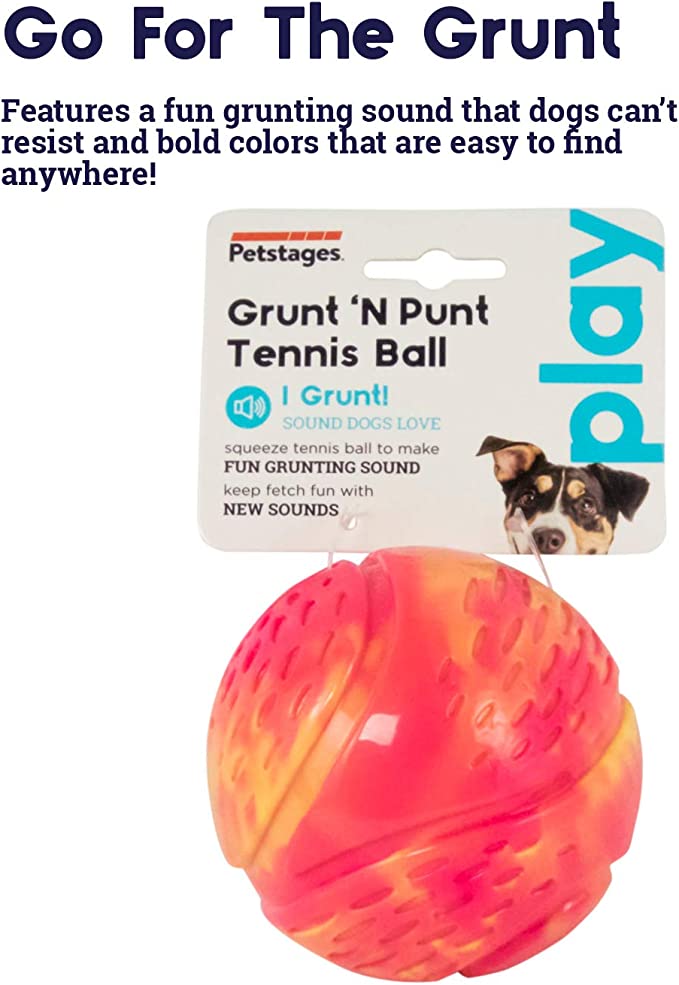 The Petstages Grunt N' Punt Tennis Ball features a grunting sound that dogs love. Just give it a squeeze and send it flying to keep your dog fetching happy. Durably designed with a tennis ball shape that's easy for dogs to carry, this ball keep your pup playing longer.