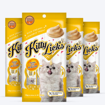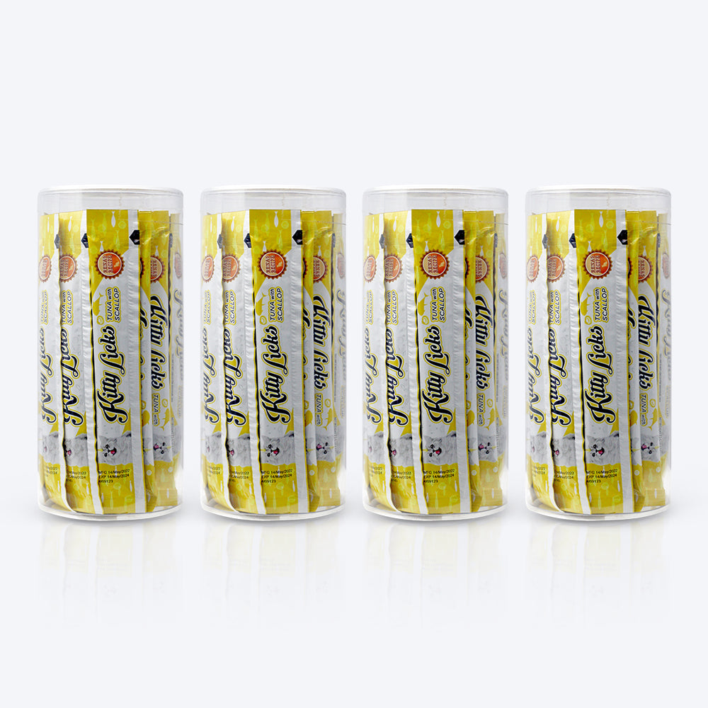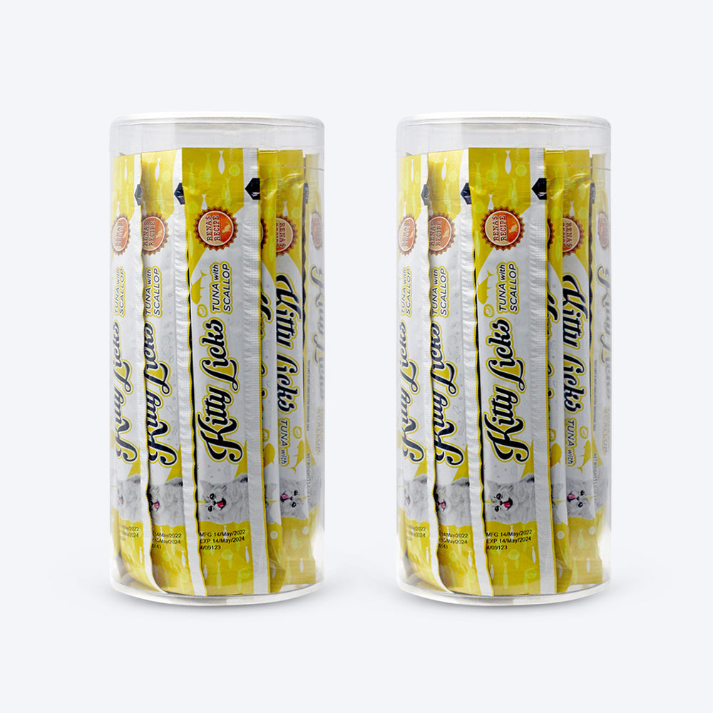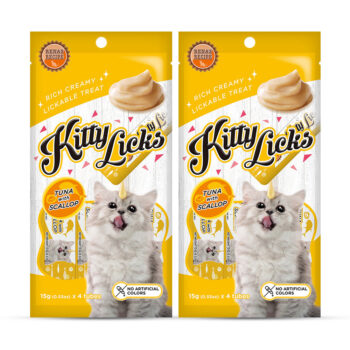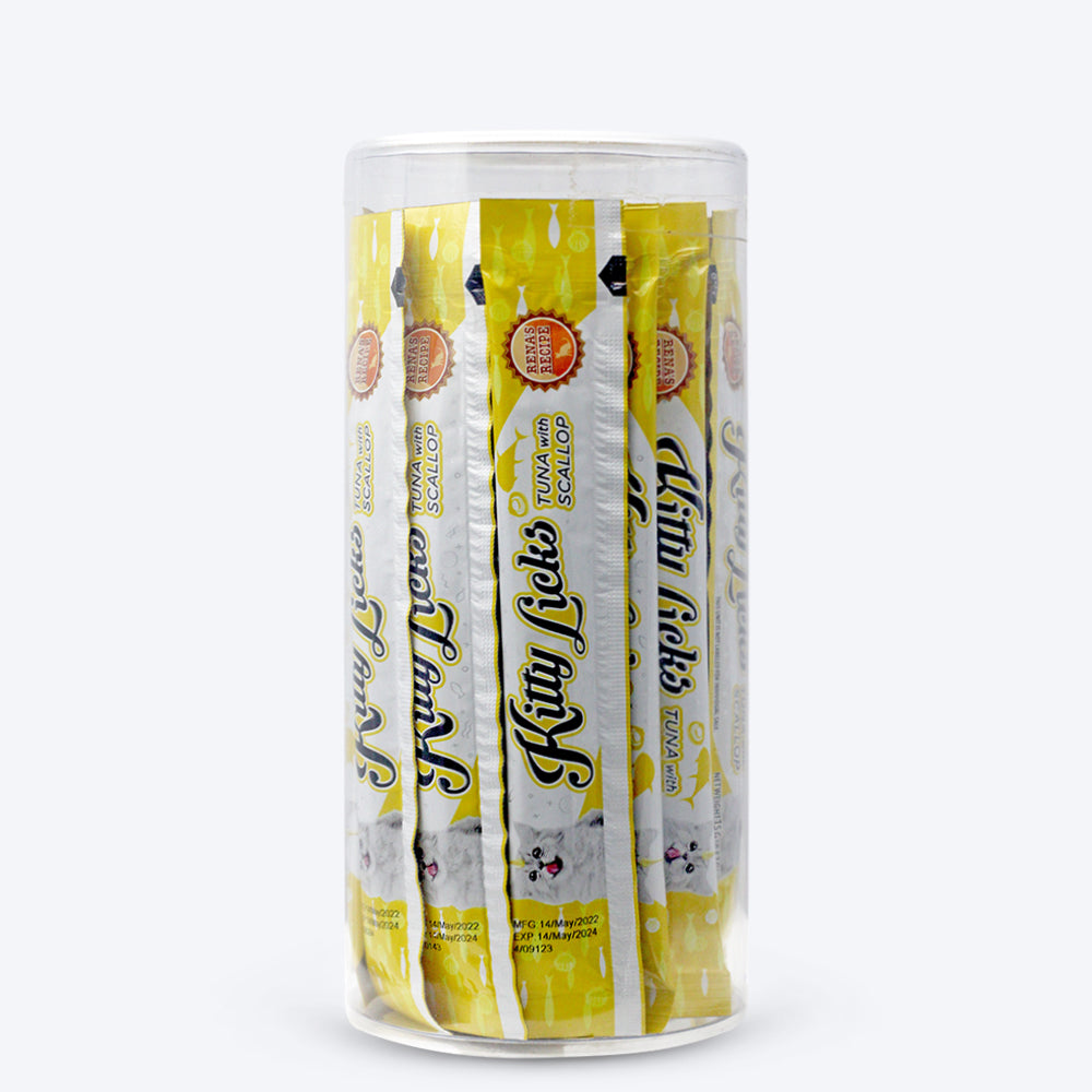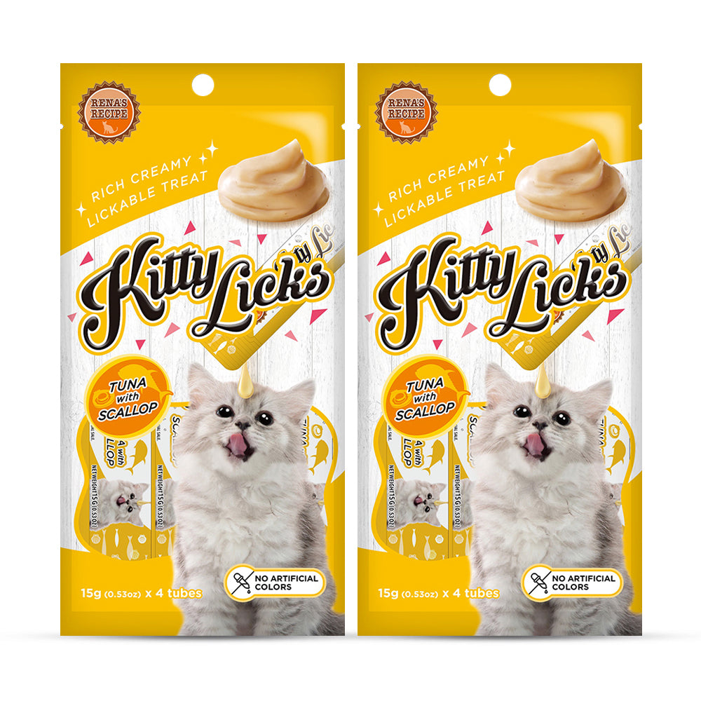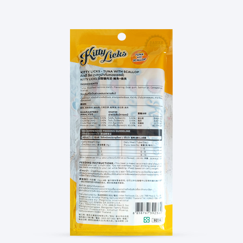 Rena's Kitty Licks Tuna with Scallop is a delectable treat for every adult cat. It contains tuna and is high in fiber, which helps the digestive system. Taurines, which are found in Rena's Kitty Licks Tuna with Scallop, help with vision. It contains Omega 6, Zinc, and DL-Methionine, which help to improve the skin and coat.' Made in Thailand. Rich Creamy, Lickable Treat. Tuna with Scallop Flavor. No artificial colors used.