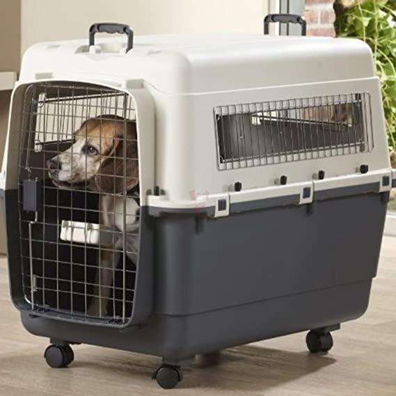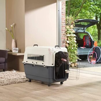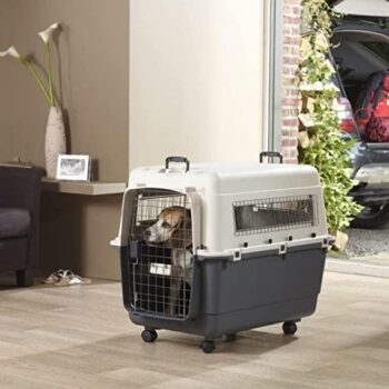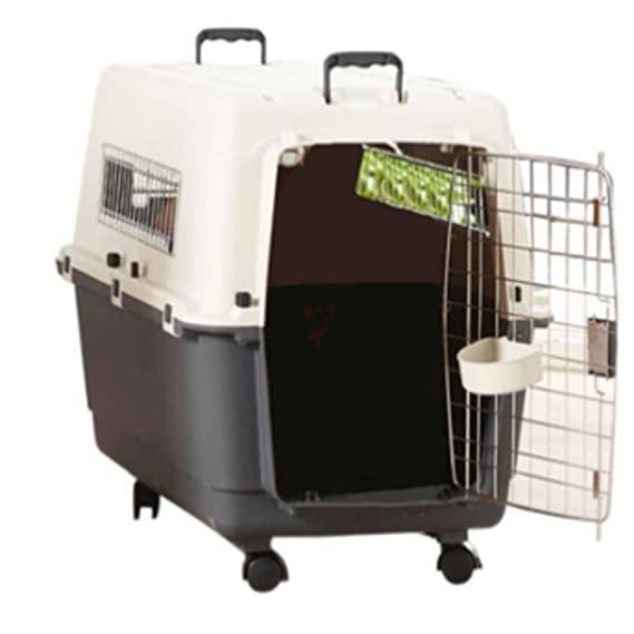 The Savic Andes 6 pet carrier has been thoughtfully designed with wheels. Now you don't have to struggle to move a heavy crate, just wheel it along, guiding it with the handles on top. With chrome vents on three sides and a grid metal door in front, it allows plenty of air circulation. The top and bottom halves are held together with secure wing nut fasteners and self-locking catches with a security blocking system. This pet carrier meets IATA standards (including the wheels). The door has an easy to use squeeze latch feeding bowl to hold a few snacks for the journey. This carrier can hold up to 35 kg and is suitable for air, water road and train travel.