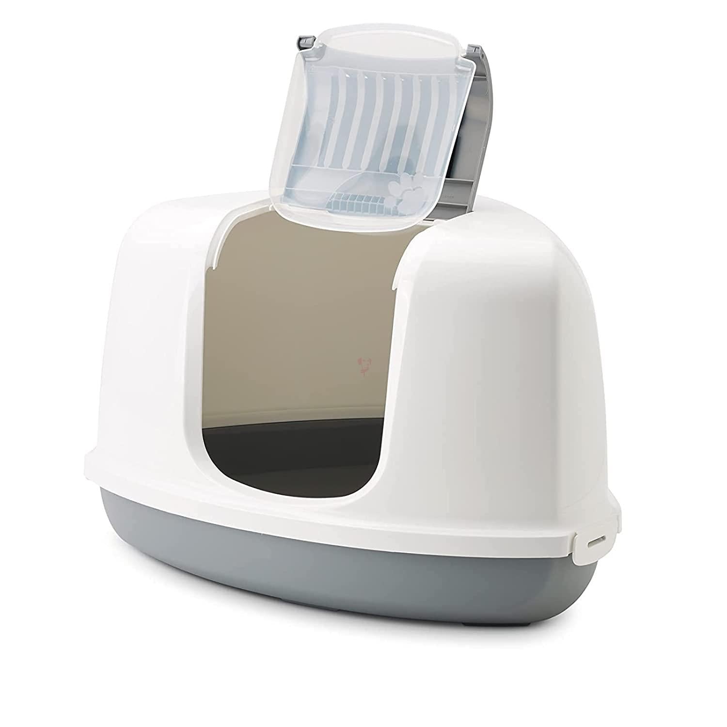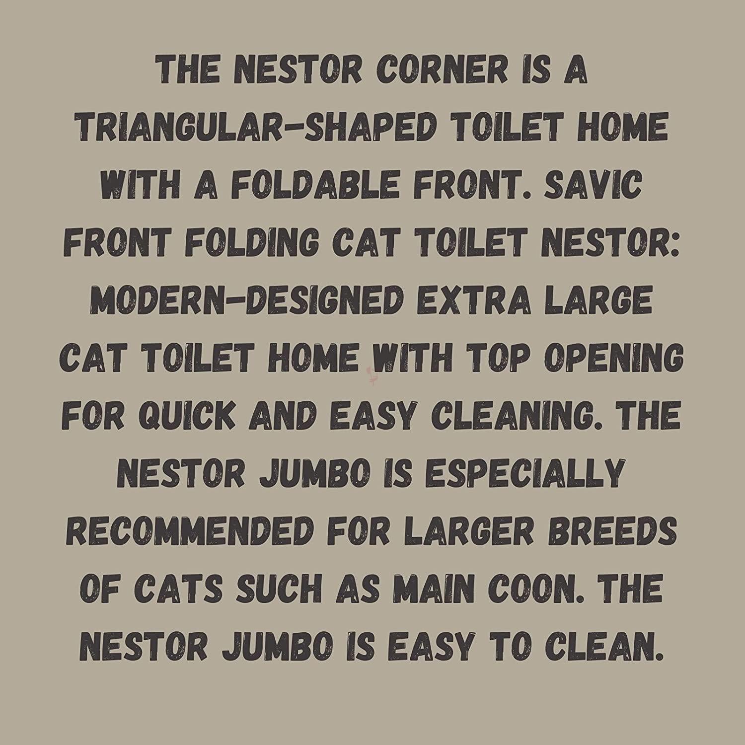 The Nestor Corner is a triangular-shaped toilet home with a foldable front. Savic Front Folding Cat Toilet Nestor: Modern-designed extra large cat toilet home with top opening for quick and easy cleaning. The Nestor Jumbo is especially recommended for larger breeds of cats such as Main Coon. The Nestor Jumbo is easy to clean. The specially developed front can be opened for. In this way, the soiled cat litter can be removed carefully and quickly without removing the top part. The tray of Nestor Jumbo has a raised back which prevents leakages. With a handle, plastic swing door, and replaceable carbon filter to absorb unpleasant odors. The Nestor Corner is a space-saving toilet home. Thanks to the triangular shape, it fits neatly in the corner of the room, which makes the litter box a space-saving and practical solution. Moreover, the Nestor Corner has a foldable front which makes the toilet home easy to clean. The specially developed front opens wide, allowing the soiled litter to be removed carefully and quickly without removing the top part. Furthermore, the Nestor Corner has a replaceable filter to absorb unpleasant odors, a built-in handle, and a transparent swing door. cat toilet home specially designed to place in corners, saves space with foldable front for easy maintenance with filter, transparent swing door, and integrated handle.