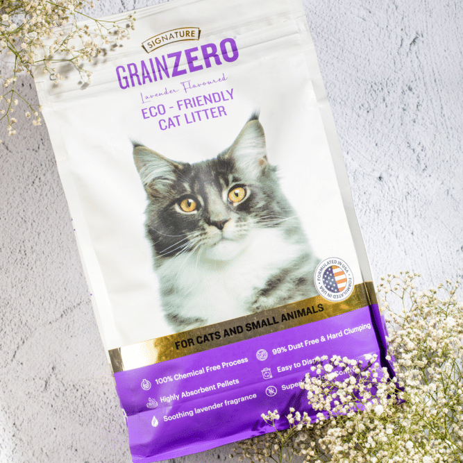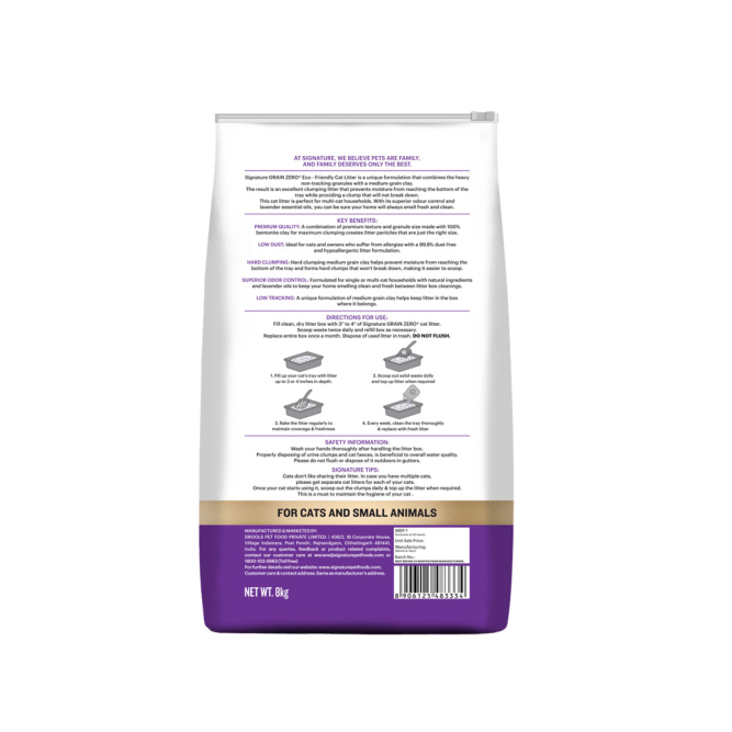 Crafted with 100% bentonite clay, this natural Grain Zero premium cat litter offers the perfect balance of heavy non-tracking granules with a medium-grain clay. What does that do? The hard clumping medium-grain clay effectively blocks moisture from seeping into the tray's bottom and also ensures there's minimum tracking. The hard clumps will not break down easily, making scooping the litter a super easy task. The low dust and hypoallergenic formula makes it ideal for both cats and their parents suffering from allergies. Designed for single or multi-cat households, Signature's Grain Zero Cat litter has a strong odour control. The lavender fragrance will keep your home smelling fresh and clean between litter box cleanings.