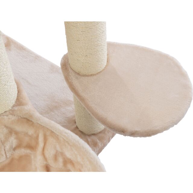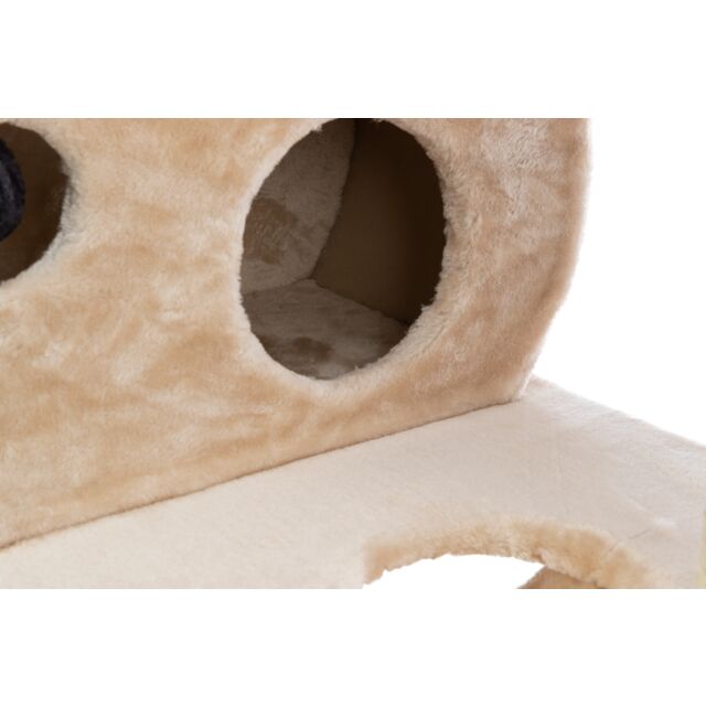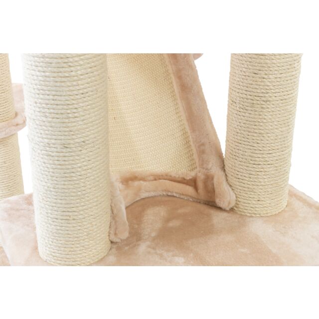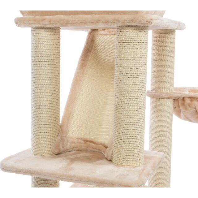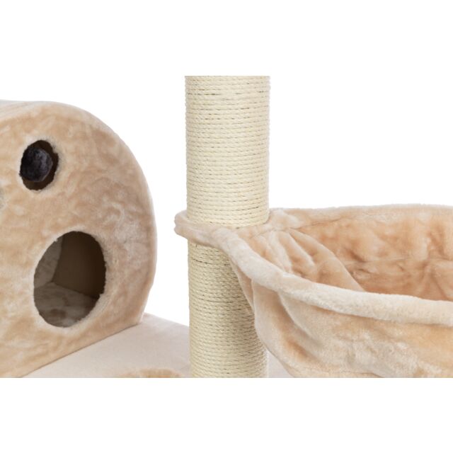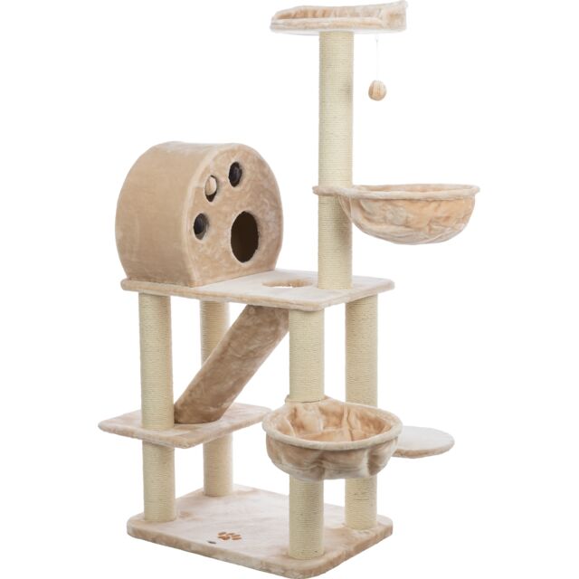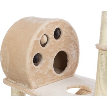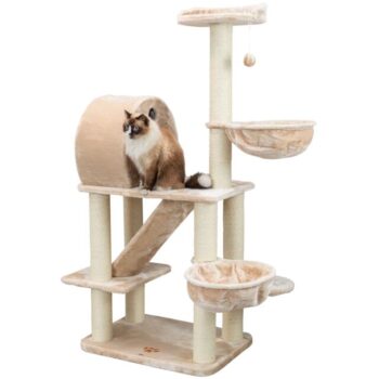 Trixie’s Allora Cat Playground is sure to entice any playful feline and can easily accommodate multiple cats. Spunky cats can climb to new heights on one of four plush platforms and lie in wait for unsuspecting prey or simply enjoy the view. The top platform has extra padding and a backrest for added comfort. Need a healthy outlet for your cats scratching instincts? Felines can sharpen their claws on the scratching posts and scratching ramp instead of on your furniture or carpet. All posts are covered in durable sisal. For a nap or a cozy retreat, the cat can crawl inside the kitty condo with peek-a-boo holes or cuddle up in one of the hammocks. They have metal rims for added support. We’ve even included dangling pom-pom toys for extra fun. The neutral tones are easy to integrate into your home decor. Suitable for cats of all ages and activity levels.