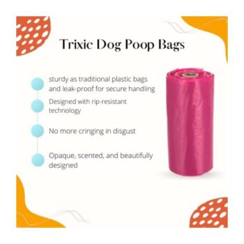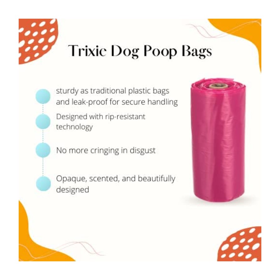 Trixie lavender scented dog poop bags The poop bags from Trixie are handy plastic poop bags on a roll that fits in any dispenser, with a nice lavender scent.