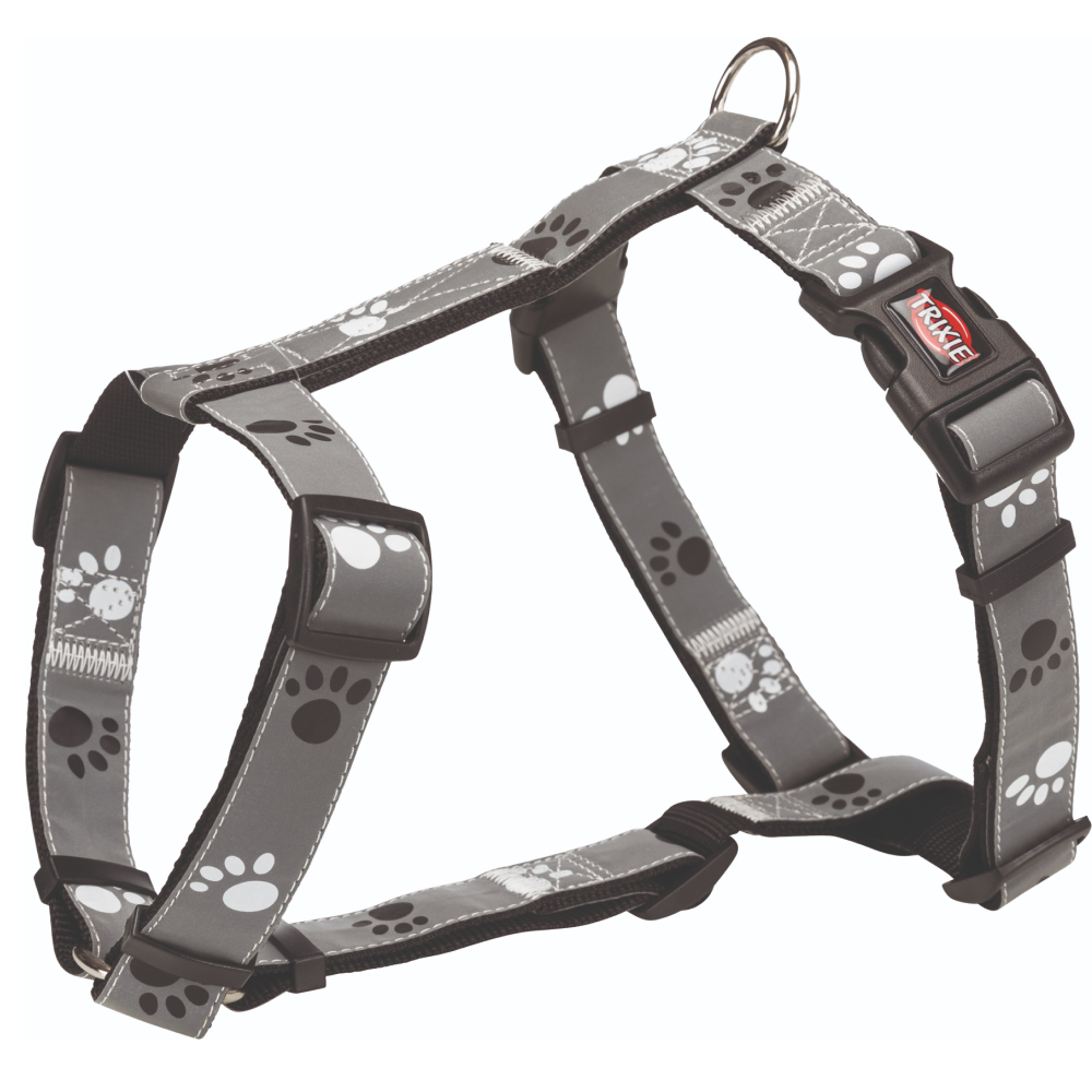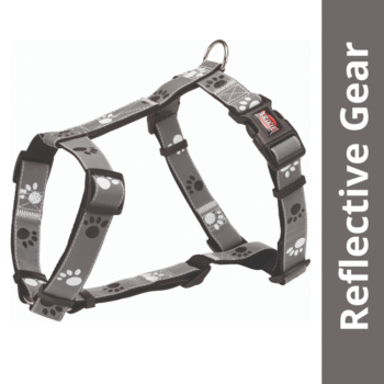 Plastic top and webbing inner side. Reflective, Breast strap, neck and belly strap continuously adjustable. Black colour webbing tape. Silver grey with paws motif strap.