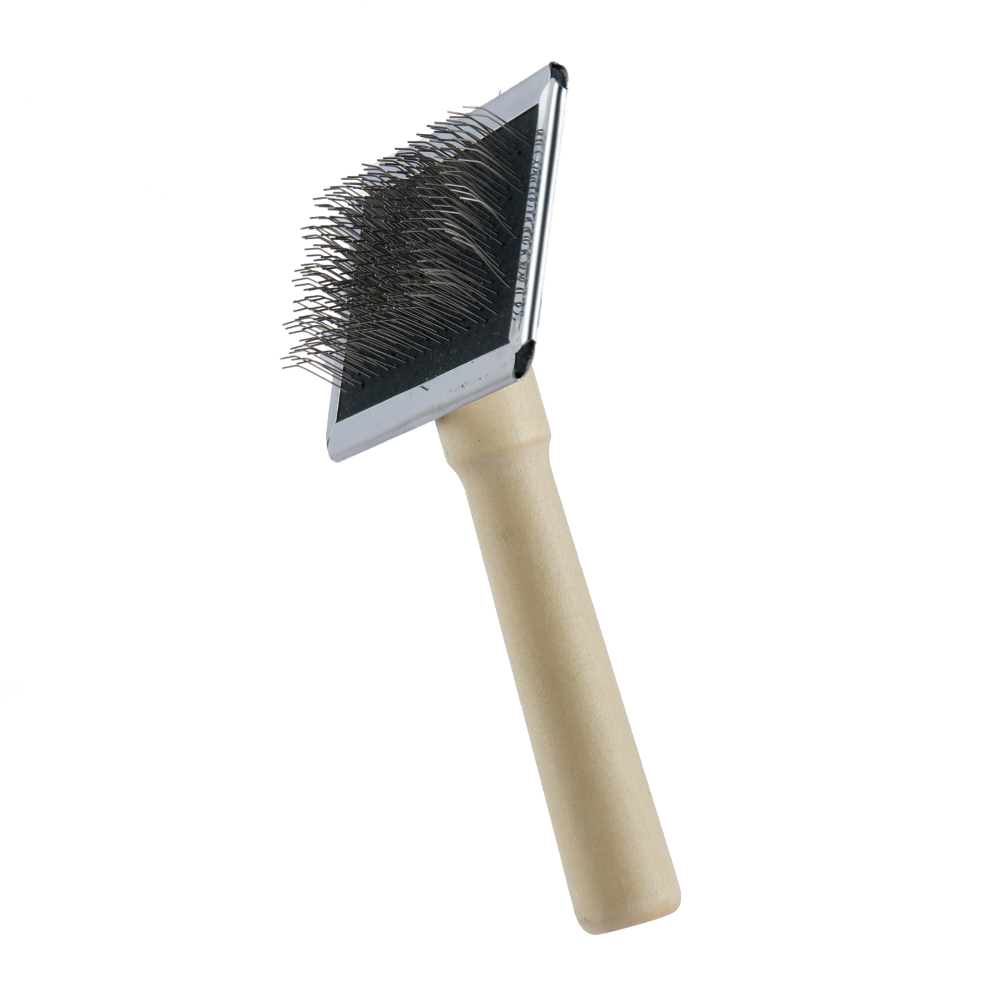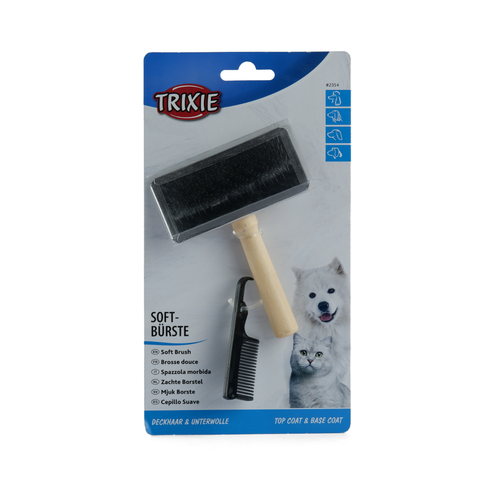 Soft brush with colourful wooden handles. The brush head is made of stainless steel. The soft brush is suitable for the care of the dog's undercoat (also suitable for cats). They protect the undercoat from getting tangled up. Lose or dead hair will be removed and tangles will be prevented. The included brush cleaner helps to clean the soft brush quickly and easily.