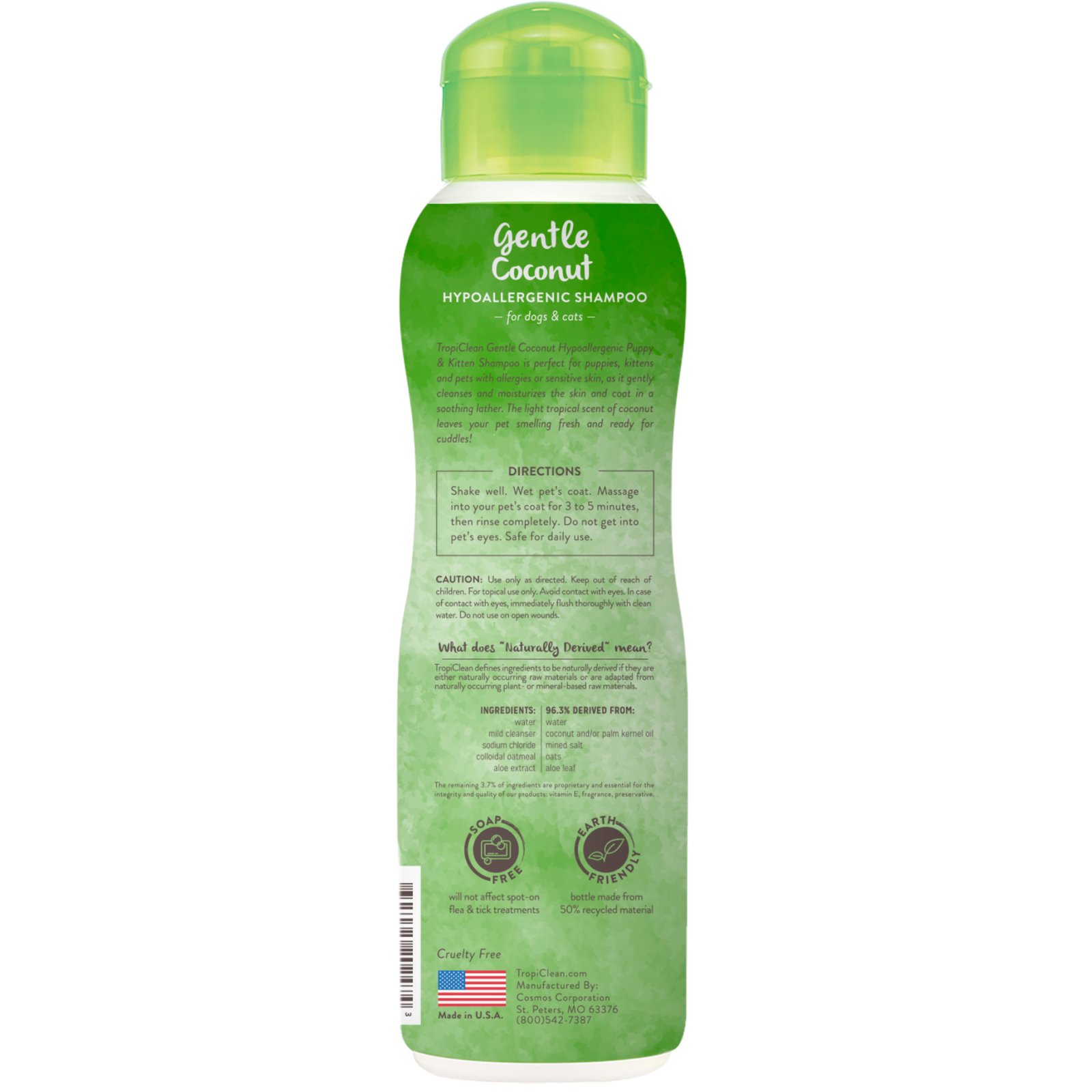Tropiclean Gentle Coconut Shampoo is specially for puppies, kittens, and pets with allergies. Coconut gently cleanses your pet's coat while aloe replenishes skin's moisture for a fresh, healthy, clean bath time. Conditioners are also available on the website.
