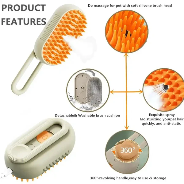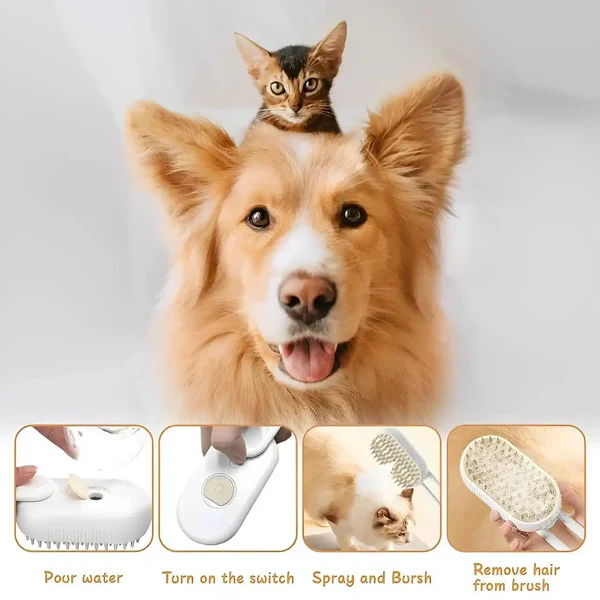 Presenting the 3-in-1 Pet Steam Brush with Spray Function, ideal for both cats and dogs. This multipurpose brush effectively manages pet shedding, steam cleaning, and massaging by combining hot steam functions, guaranteeing a clean environment and happy dogs. The ergonomic handle and small size of the device make it simple to use on your pet. It guarantees a hygienic grooming experience with each usage thanks to its detachable brush head for effortless cleaning.